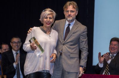 La empresaria Manuela Gómez Santana recoge su distinción de manos del Consejero de Medio Ambiente, José Fiscal.