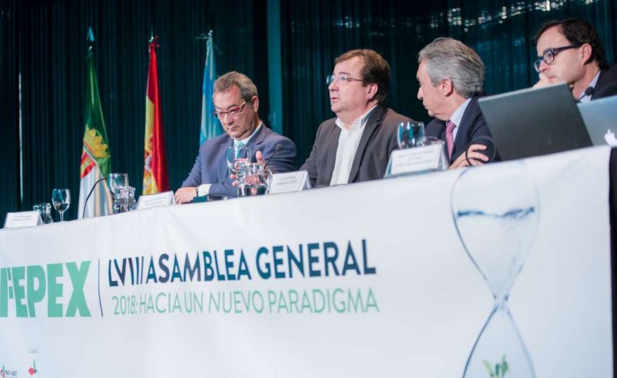 El presidente de Extremadura clausura la asamblea de Fepex defendiendo un pacto nacional en agua, energía e infraestructuras