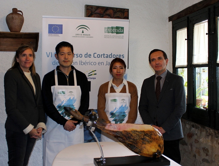 Saki Yokogawa y Shimpei Shinozaki, ganadores del VI Concurso de Corte de Jamón en Japón que organiza Extenda-Agencia Andaluza de Promoción Exterior con la colaboración de las empresas ConsorJabugo, Hermanos Rodríguez Barbancho y Cinco Jotas visitaron en el día de hoy la zona de cría del cerdo ibérico en Cumbres Mayores. Este es el premio