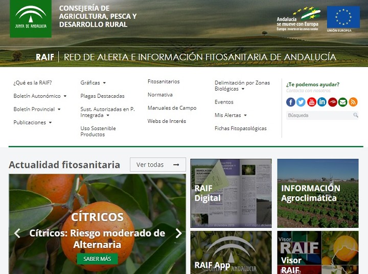 La Consejería de Agricultura, Pesca y Desarrollo Rural ha actualizado el diseño gráfico de la web de la Red de Alerta e Información Fitosanitaria (RAIF) de Andalucía para adaptarla mejor a las necesidades de los usuarios. Con este cambio, da un paso más en su avance digital y le confiere una imagen más atractiva, incorporando