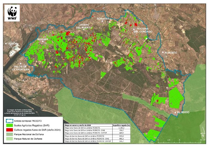 Ante el inicio de la plantación de fresas en la nueva campaña agrícola, WWF denuncia que, «en estos momentos, en Doñana se siguen regando 1180,2 hectáreas fuera de la superficie agrícola regable (SAR), delimitada por el Plan Especial de la Corona Forestal. De ellas, casi el 80 % son cultivos de frutos rojos ilegales». WWF