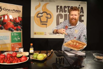 Los frutos rojos de Cuna de Platero han sido los protagonistas de la receta que ha elaborado el cocinero Daniel del Toro en Factoría Chef, un espacio para la divulgación e interpretación gastronómica de los productos hortofrutícolas. El showcooking se ha titulado: «Fusión cromática con sabor a Huelva: del rojo al azul. Tartar de frutos rojos y melva».
