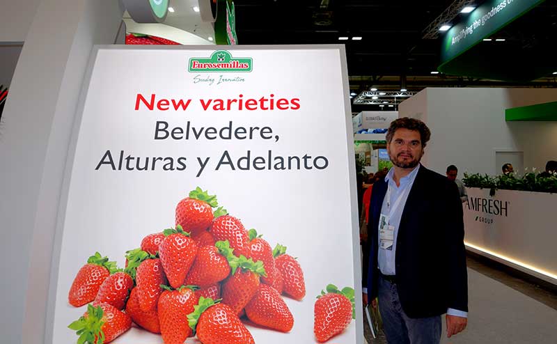 Manuel Cano, gerente de Eurosemillas, junto a las nuevas variedades de fresa que ha sacado al mercado.