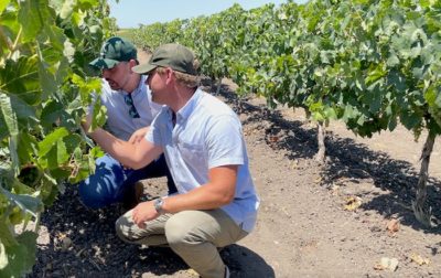Felipe Capobianco (izquierda), responsable técnico global del proyecto de Fincas Demostrativas, visitando un campo de demostración de control biológico en viñedo ubicado en Cádiz.