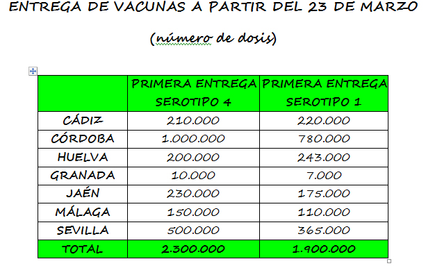 En esta primera entrega, a Granada le corresponderán 10.000 vacunas del serotipo 4 y 7.000 del serotipo 1; a Jaén 230.000 frente al serotipo 4 y 175.000 contra el serotipo 1; a Sevilla, 500.000 dosis del serotipo 4 y 365.000 del serotipo 1; y a Málaga, por último, 150.000 vacunas frente al serotipo 4 y 110.000 frente al serotipo 1.