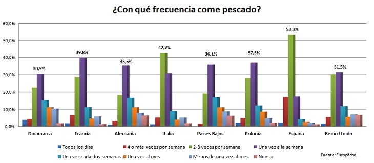 El 75% de los españoles consume pescado un mínimo de 2-3 veces por semana, lo que sitúa a nuestro país a la cabeza de Europa, según la primera encuesta realizada sobre Consumo de Pescado y el Papel del Sector Pesquero en la Unión Europea. Los españoles se destacan así, frente al 70% de los europeos que declara consumir pescado una vez por semana.
