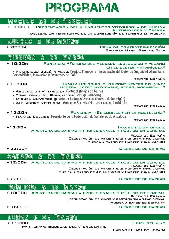 La inauguración de las carpas que participan en este Encuentro será a la 13.30 horas en la plaza de España de La Palma del Condado. La edición de este año se dedica a los vinos andaluces por lo que están invitadas 5 denominaciones de origen: Condado de Huelva, Jerez-Xéres-Sherry, Montilla Moriles, Granada, Málaga y Sierras de Málaga. Asisten bodegas de las 8 provincias andaluzas, en total 24