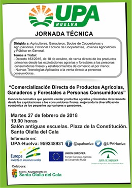 La Unión de Pequeños Agricultores y Ganaderos en Huelva, UPA-Huelva, va a celebrar este próximo martes 27 de febrero en el Salón de Antiguas Escuelas de Santa Olalla del Cala una Jornada Técnica sobre ‘Comercialización de productos agrícolas, ganaderos y forestales a personas consumidoras’.